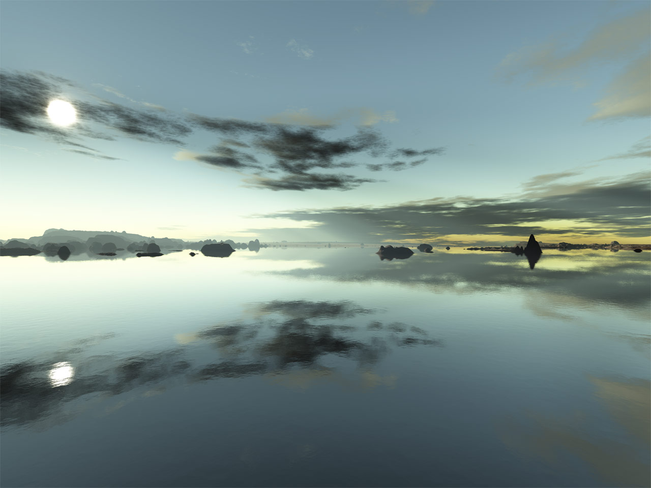 this time i haven’t tried to improve. this time i tried to create a different kind of scenery from my usual stuff. i rendered the pic 2 times with different atmosphere and water settings. i combined the pics in PScs to make them fit to the idea i had in mind. later on i added the big planet – clouds abd particular parts of very early renders of mine. also added various textures to the clouds. the clouds needed the most attention in this one – i’m still not happy but i don’t know what else more to do. the terrain was from the net somewhere… and the atmosphere file i got from *hypnotic. though i changed a lot of settings to make them match my ideas… thanks out to *hypnotic.